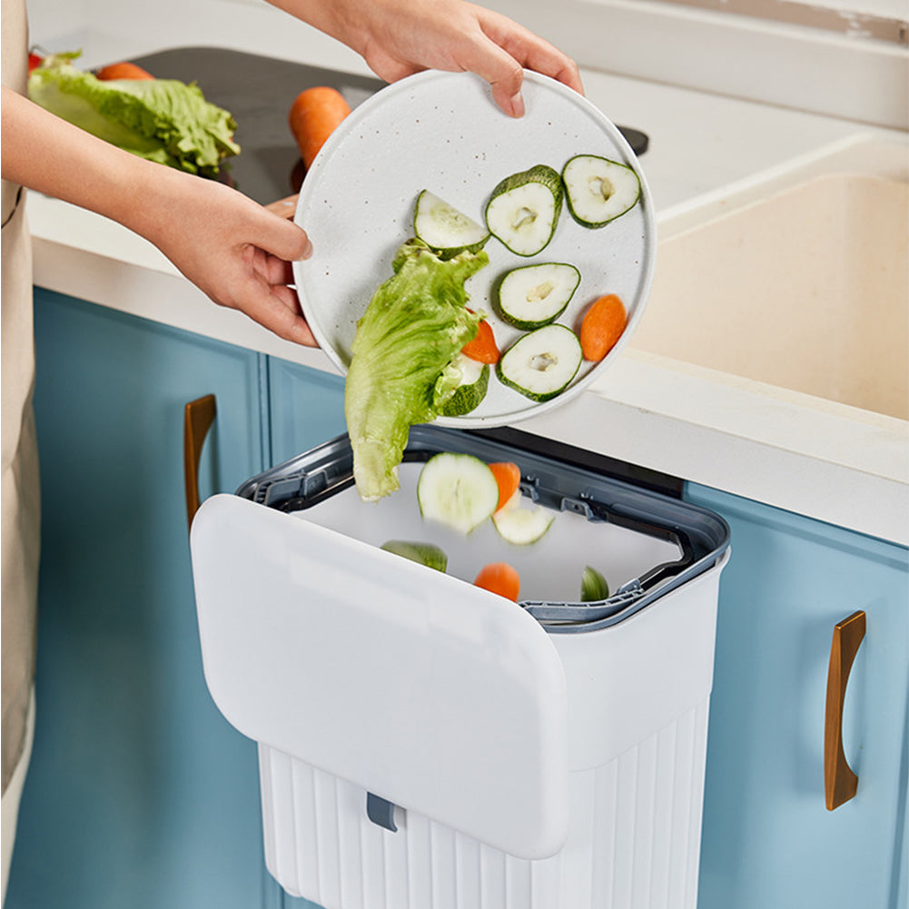 This trash can is a convenient and space-saving solution for managing your kitchen waste. Made from high-quality PP material, this trash can is durable and long-lasting. Its compact size allows you to easily attach it to cabinet doors or the side of your kitchen top, saving valuable floor space. The lid can be easily flipped or slided down to open. With a generous capacity, this waste bin is perfect for collecting food scraps, packaging materials, and other kitchen waste.
