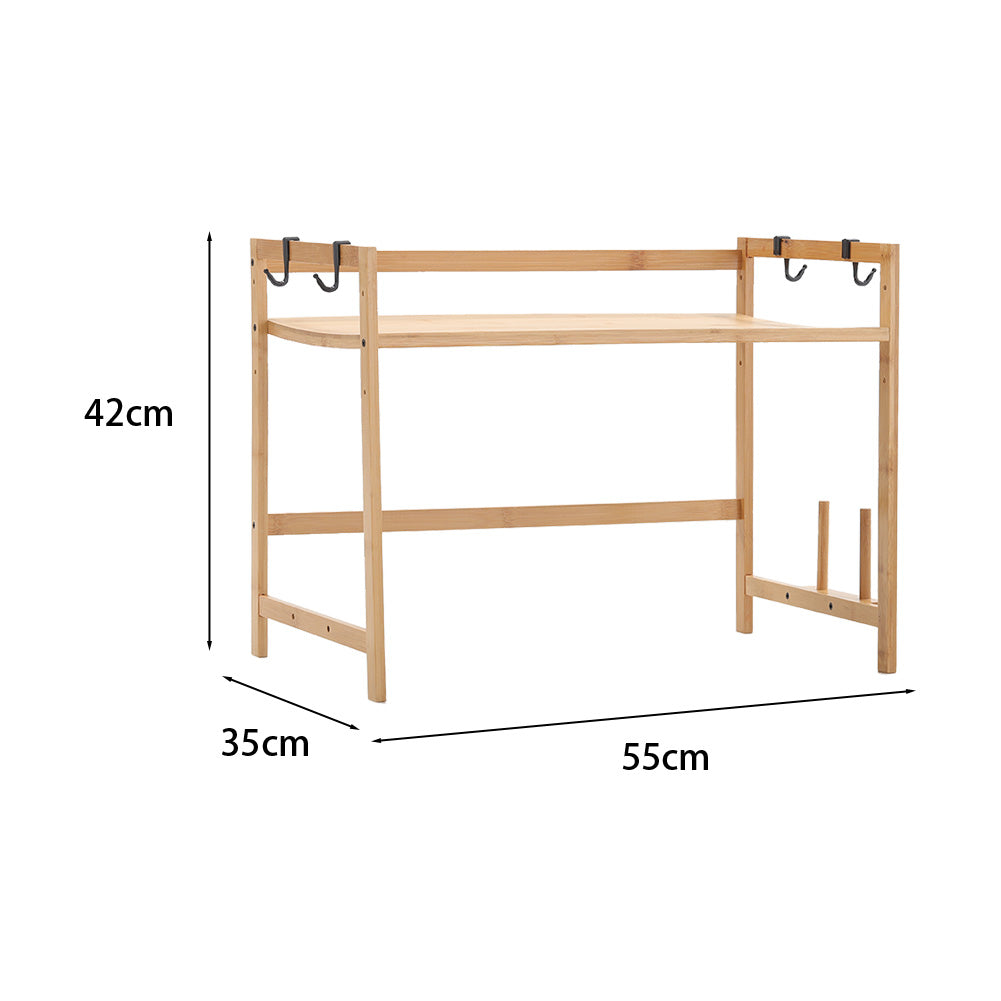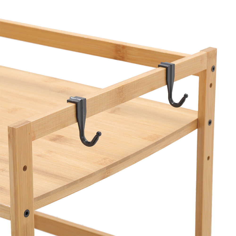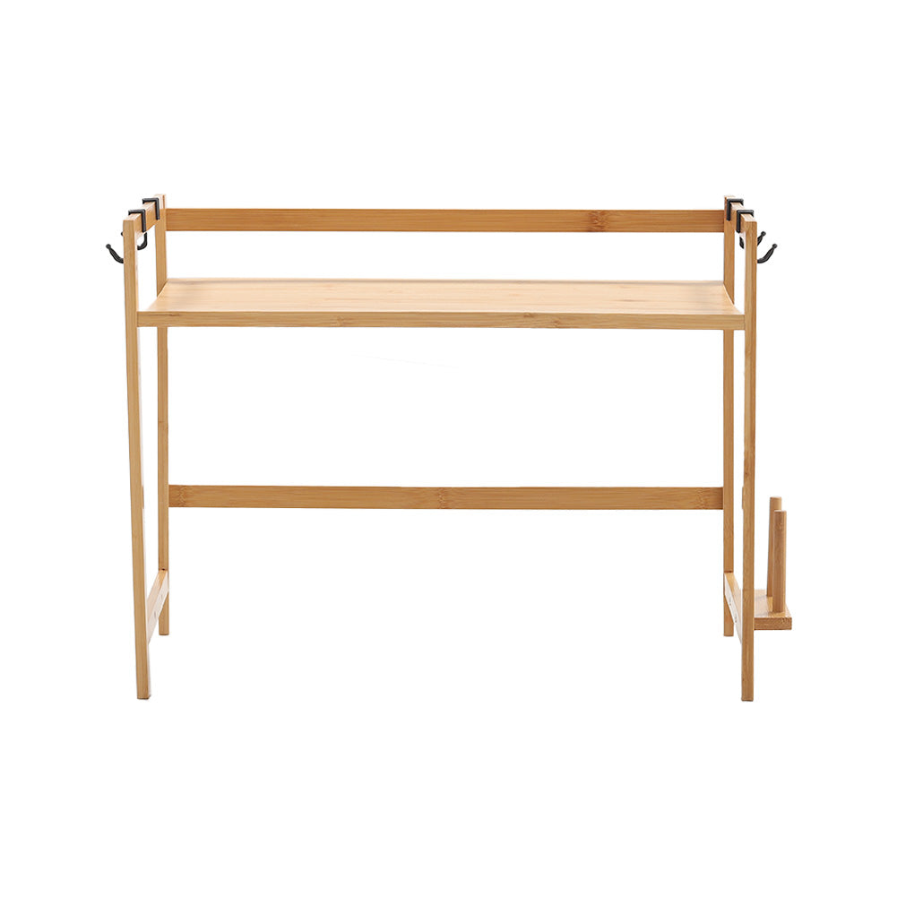 Want to tidy up your kitchen and make all the spice jars in order? Our free-standing kitchen organizer is your best solution. Frame made of natural bamboo ensures sturdiness and durability, allowing it to fit in kitchen environment. Some hooks are included for hanging cutlery and you can rest the chopping board on the side. The upper tier offers space for your spice jars while you can put a microwave oven underneath. Organize your messy kitchen with this kitchen organize rack!
